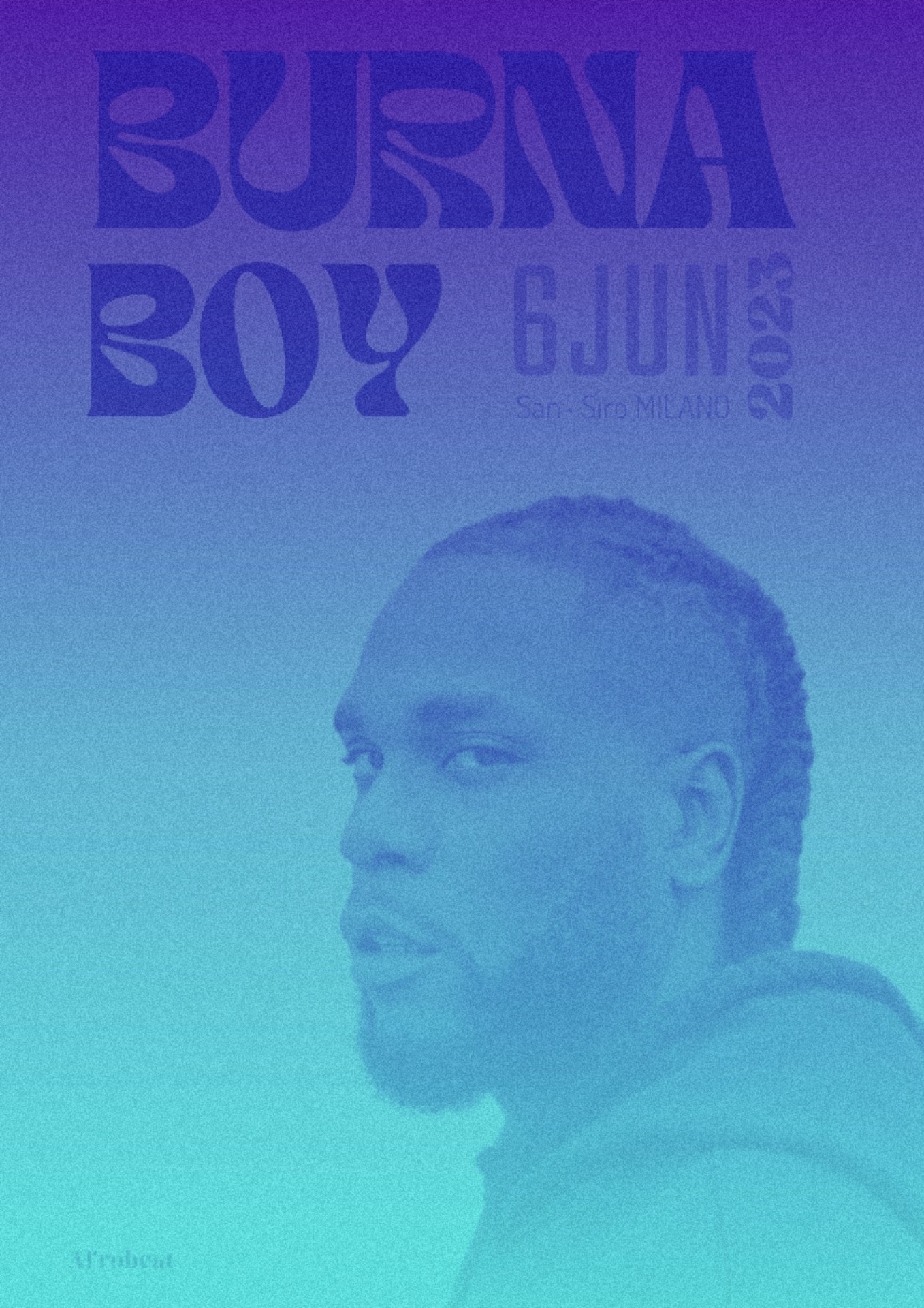 In questo progetto mi hanno chiesto di realizzare un volantino per il mio cantante preferito. Ho scelto Burna Boy, Ho preso una sua foto e l'ho posizionata in basso a destra dopo aver tolto lo sfondo su photodhop. Poi ho o scritto il suo nome in alto con un font che riporta allo stile del cantante. Accanto invece ho messo tutte le varie informazioni ( posto, data,ecc...) , poi ho aggiunto una sfumatura su tutta la pagina che va dall'alto verso il basso con i colori blu e azzurro.